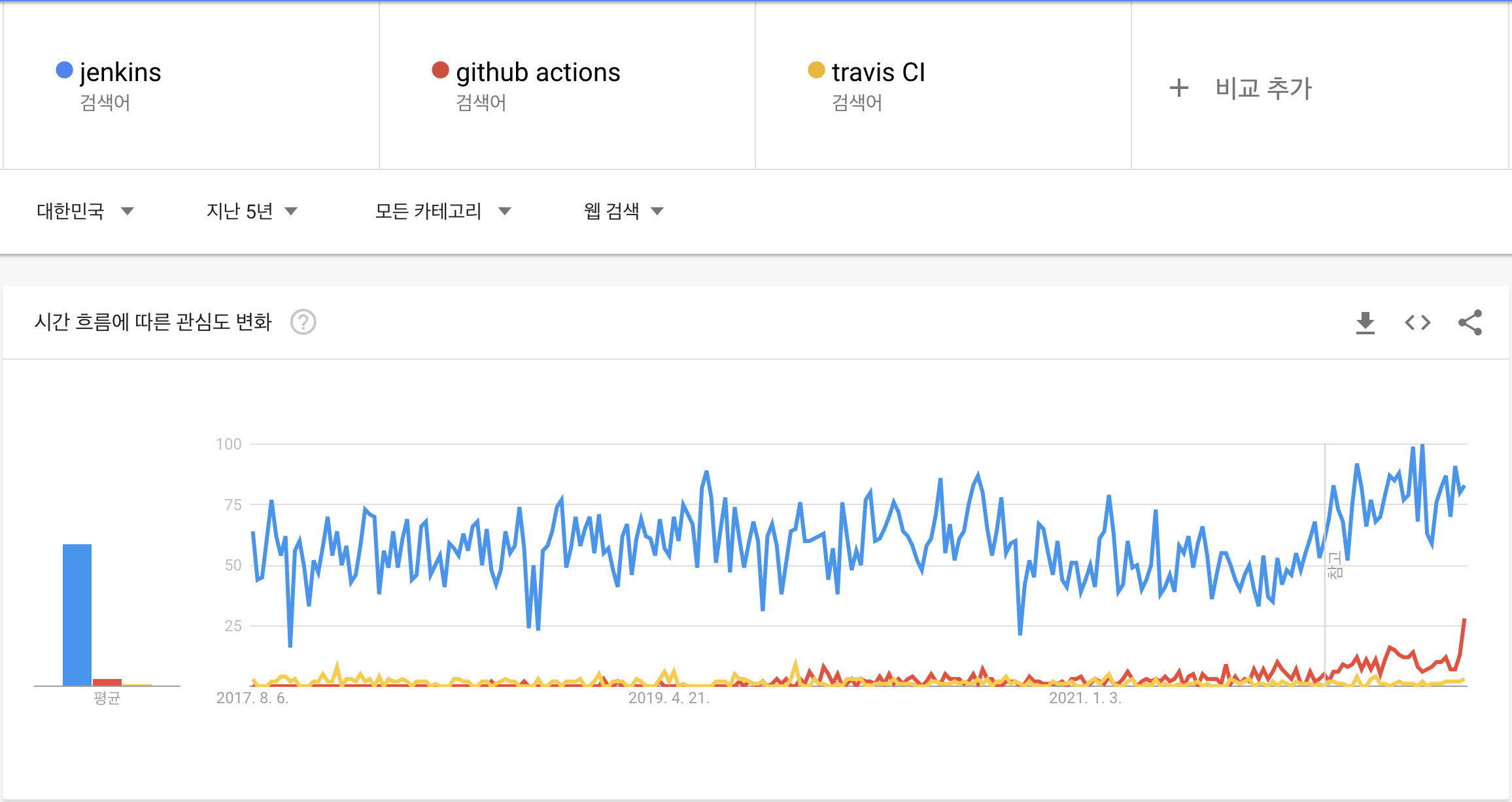 구글 트렌드를 통해, 근 5년간 CI/CD Tool의 관심도를 확인해보면, Jenkins가 확실히 압도적인 것을 확인할 수 있다.