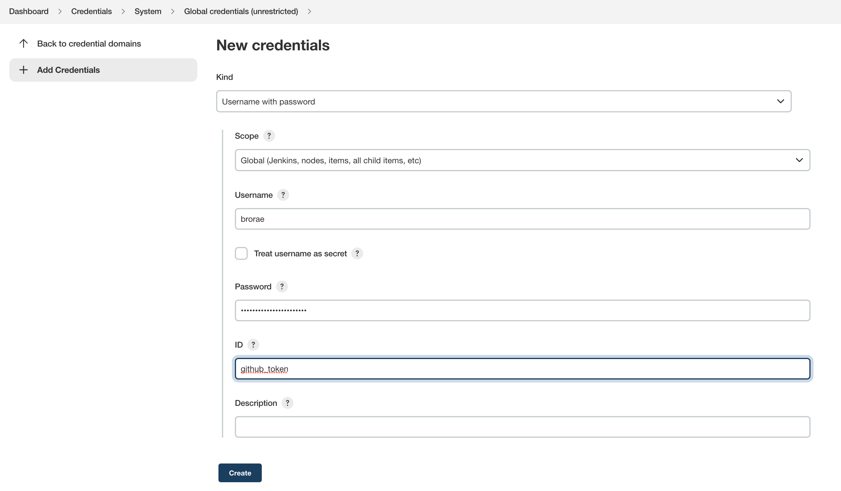 Username은 Github ID, Password는 위에서 발급 받은 Token, ID에는 Credentials ID를 작성해주면 된다.