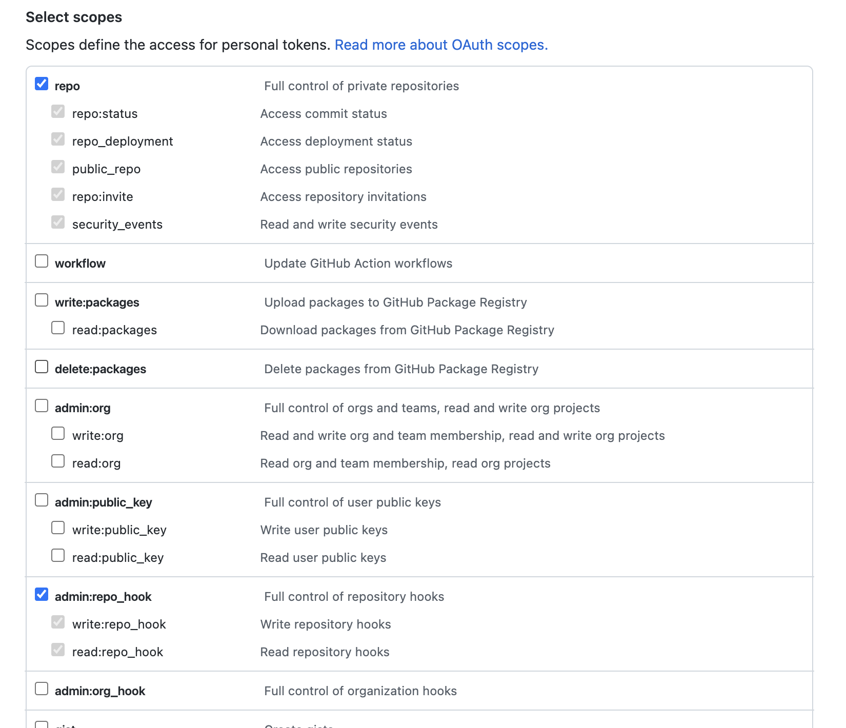 repo는 깃허브 레포지토리에 대한 권한을 부여하는 것이고 admin:repo_hook은 레포지토리의 훅에 대한 권한을 부여하는 것이다.