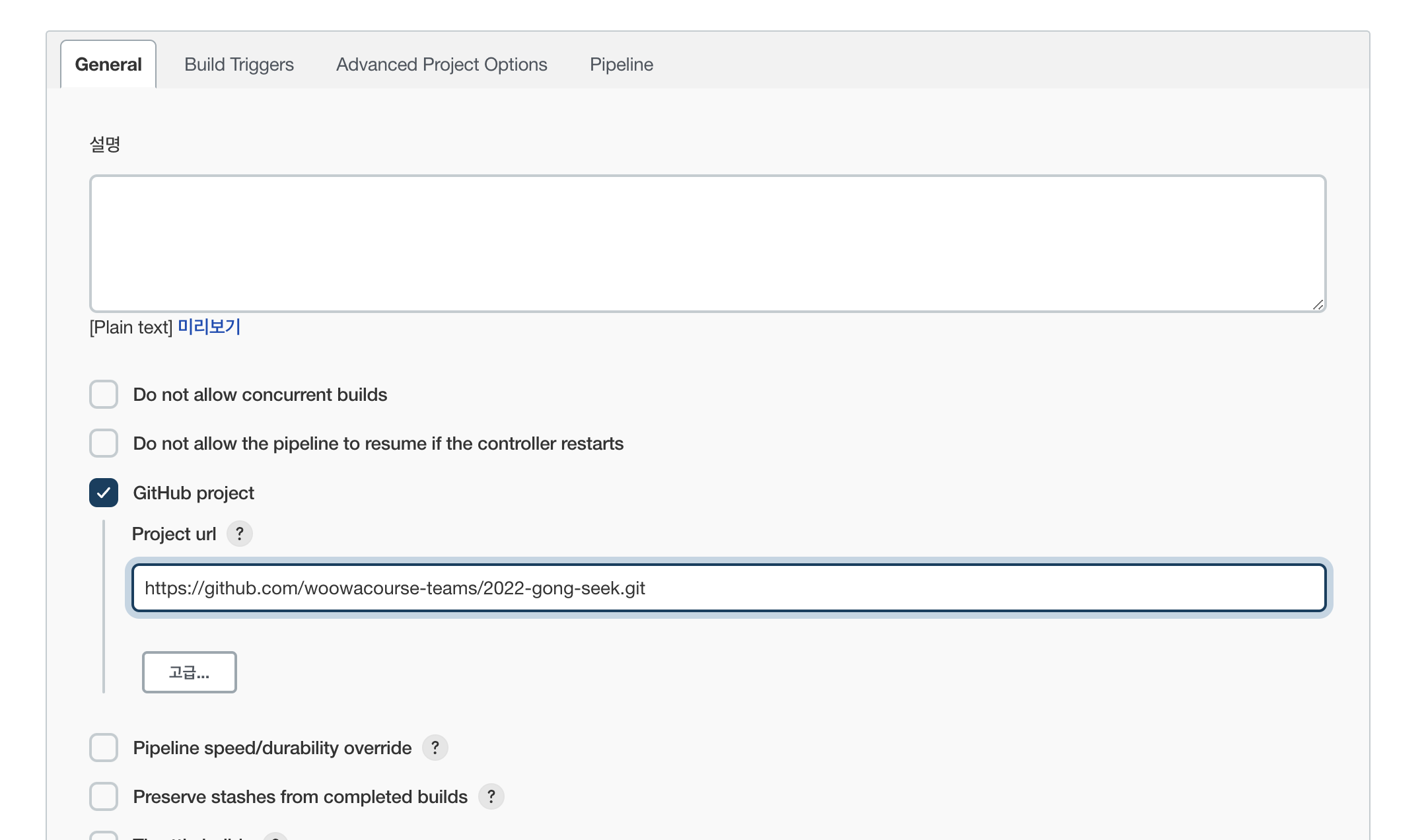 프로젝트 url에 CI/CD를 설정할 Github Project url을 작성해준다.