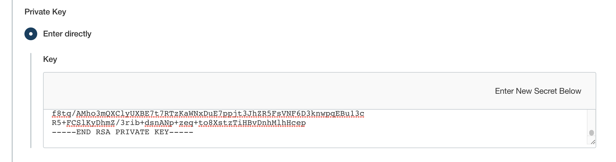 그 후 아래에 보이는 Enter directly를 클릭하면 아래와 같이 pem key를 입력할 수 있는 창이 나오는데 이 곳에 pem key를 입력해주면 된다. cat {key 이름}.key 를 통해 나오는 키 값을 -----BEGIN RSA PRIVATE KEY----- 부터 -----END RSA PRIVATE KEY-----까지 모두 복사해 입력하면 된다.