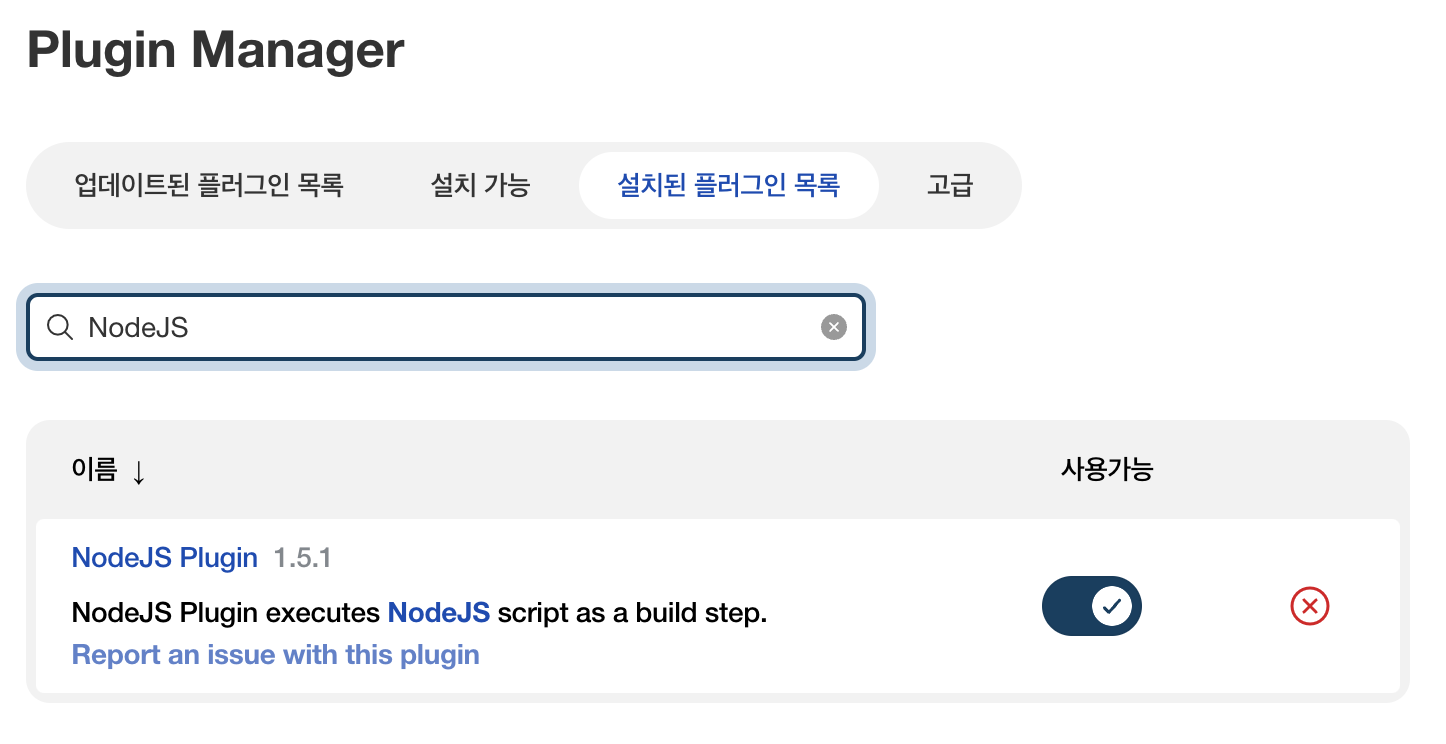 우리팀의 프론트에서는 리액트를 사용하고있다. 이를 빌드하기 위해서는 서버에 Node.js가 서버에 깔려있어야한다. 이를 위해 Jenkins에서 미리 설정을 해주어야한다. 이를 위해서 젠킨스에 NodeJS 플러그인을 따로 설치해주었다.