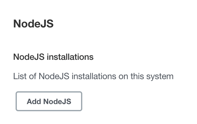 NodeJS 플러그인이 설치되었다면, Jenkins관리 -> Global Tool Configuration 으로 들어간다. 아래로 내리다보면 NodeJS 부분이 보인다.