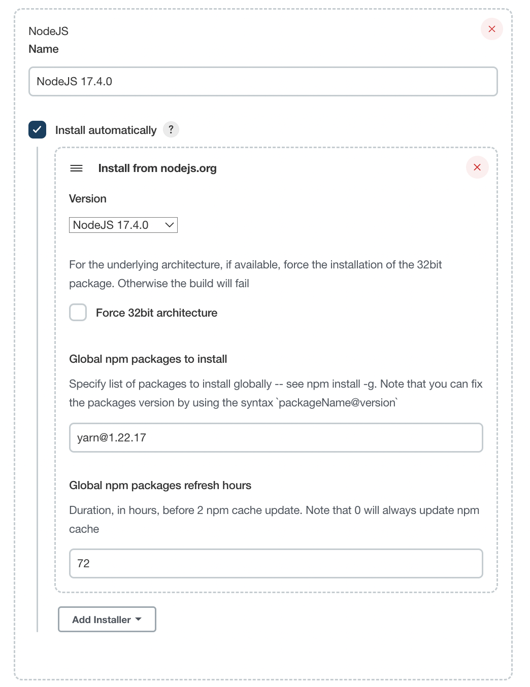 이름은 버전 그대로 Node JS 17.4.0으로 지정해주었다. Node의 npm으로도 빌드와 테스트가 가능했지만, 프론트와 상의한 결과 yarn이 성능과 보안상으로 안전하다는 이유로 yarn 패키지 또한 설치해주었다. Global npm packages refresh hours는 기본값인 72로 설정해주었다.