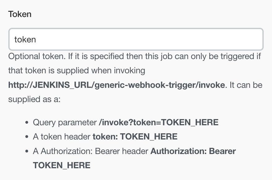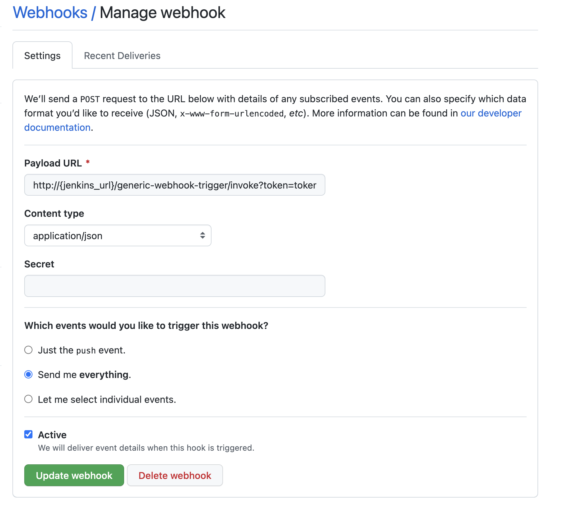 기존의 Payload URL은 http://{jenkins_url}/github-webhook/ 으로 설정되어있었을 것이다. github-webhook/ 대신 generic-webhook-trigger/invoke로 설정해주자. 그리고 application/json 과 Send me everything을 체크해준다. Send me everything의 설정은 푸쉬에 대한 웹훅뿐만 아니라. PR의 open, close,branch로의 push 등 모든 이벤트를 날리게된다. URL 뒤의 쿼리스트링으로 되어있는 token=token 부분은 아래에서 설정해줄 token 값이다. 파이프라인 설정에서도 친절하게 설명이 나와있다.