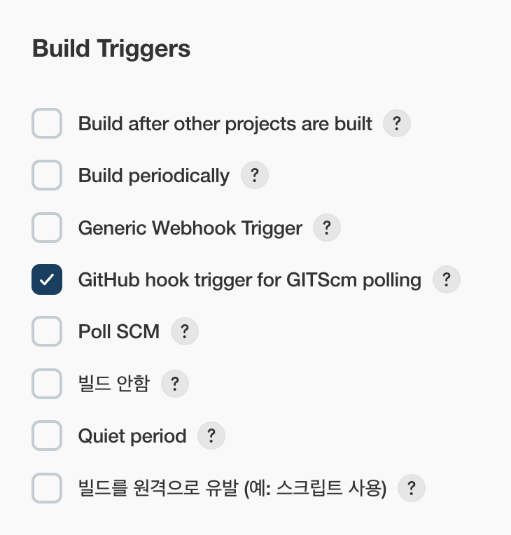 파이프라인의 빌드 유발을 설정할 때 보통은 GitHub hook trigger for GITScm polling을 많이 사용할 것이다. 이 설정은 깃허브로부터 Push 훅을 받았을 때 빌드가 유발되는 설정이다. 이 설정은 위에서 설명한 문제점이 있다.