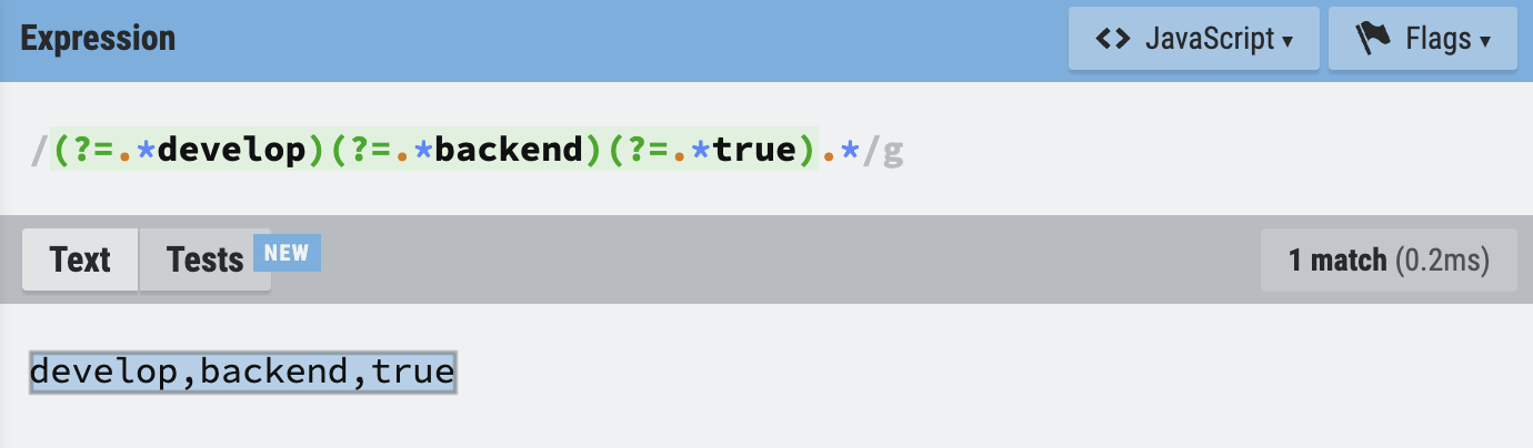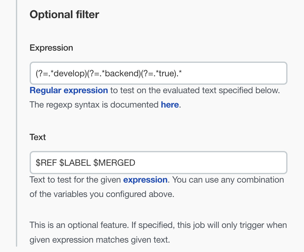 마지막으로 Expression에는 정규표현식을 Text에는 변수들을 작성해주면 설정이 완료된다. develop 브랜치에, backend라는 라벨로 머지가 된다면 빌드가 유발되도록 설정해둔 것이다.