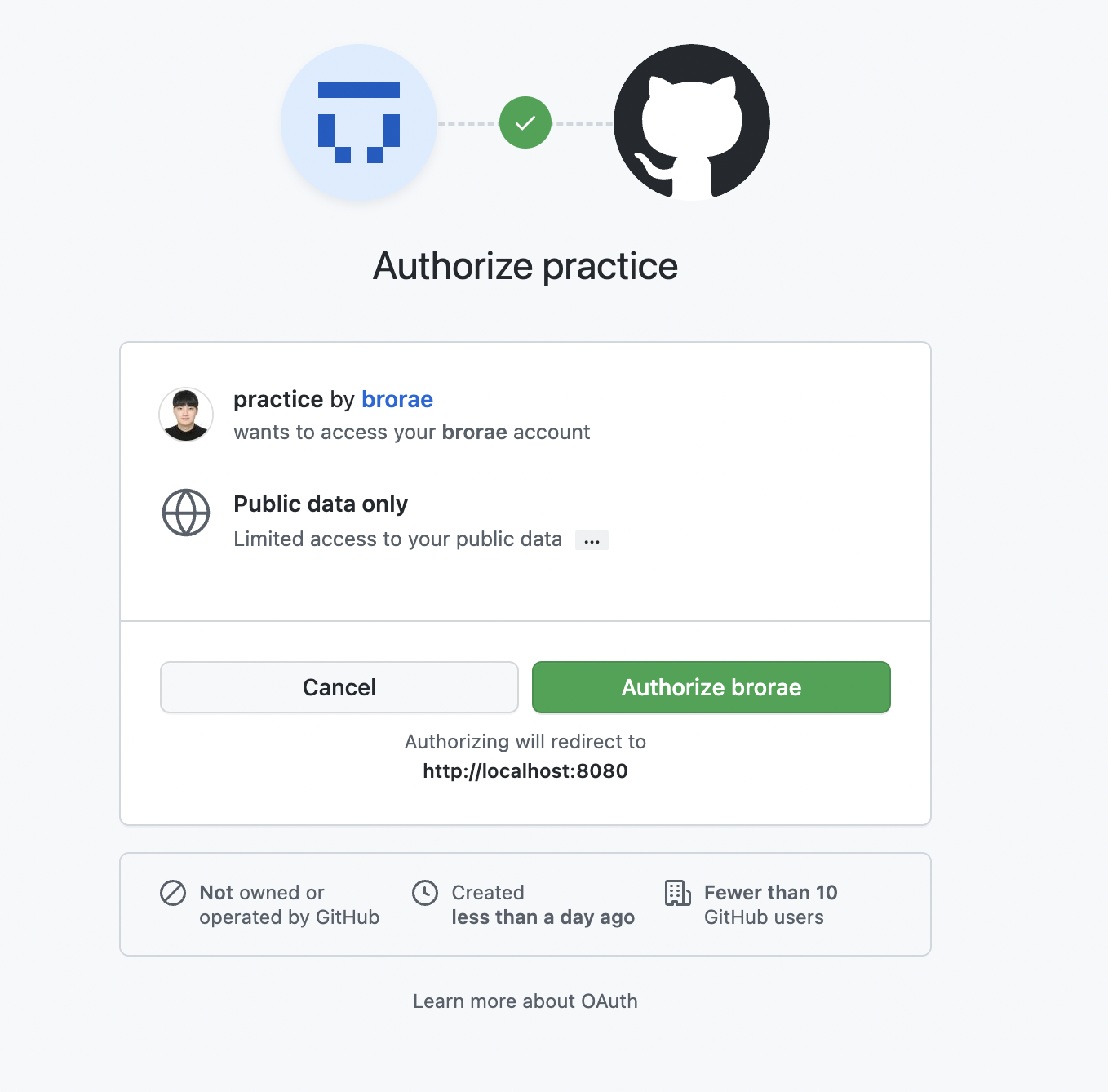 위와 같이 파라미터로 client_id와 redirect_uri를 붙여 URL을 검색해보면 아래와 같은 화면이 나온다.