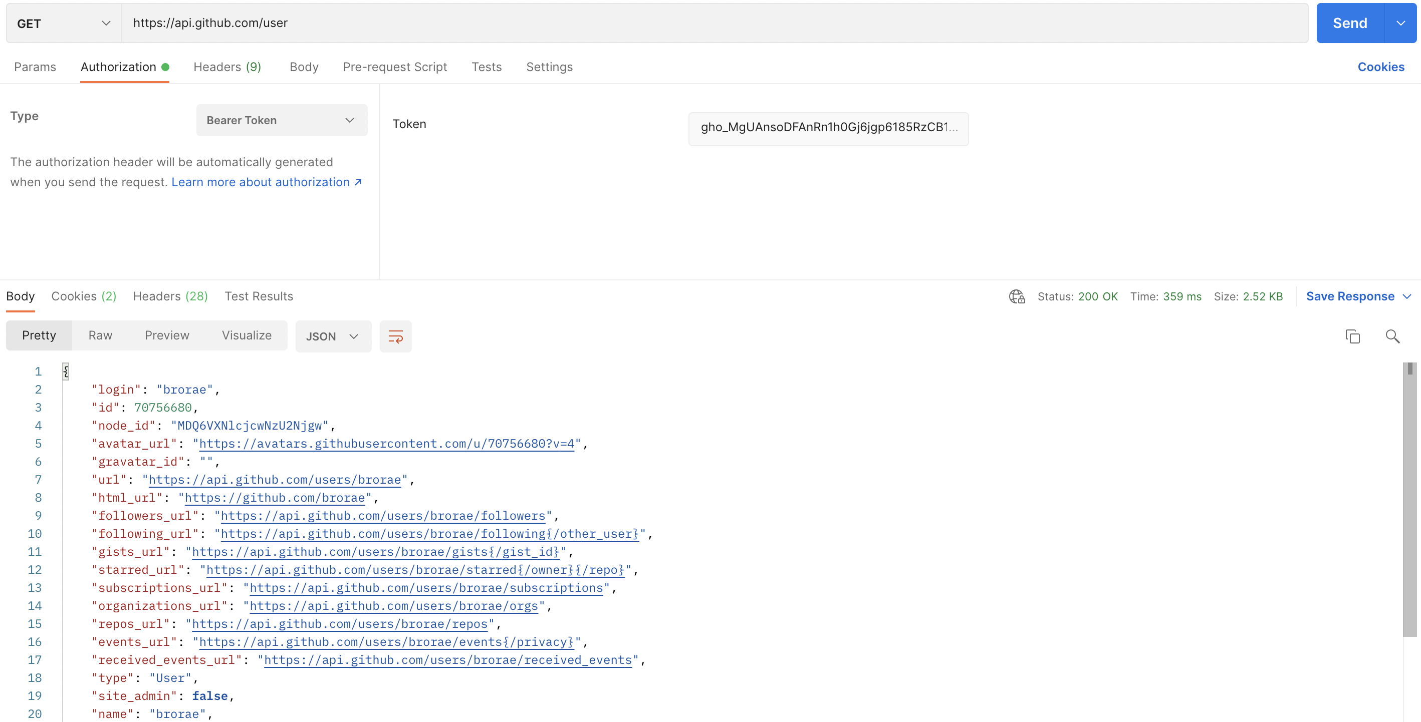 발급 받은 토큰으로 위의 URL로 Authorization에 토큰을 담아 보내면 정상적인 Github 프로필이 반환되는 것을 확인할 수 있다.