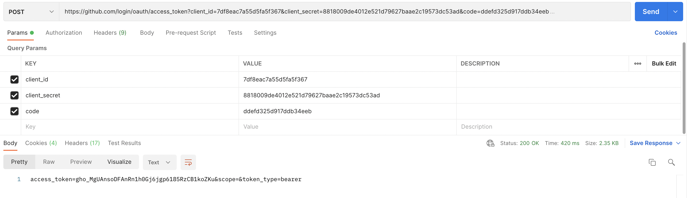 client_id와 client_secret, code를 파라미터로 함께 POST 요청으로 보내면 access_token, scope, token_type이 응답값으로 오는 것을 확인할 수 있다.